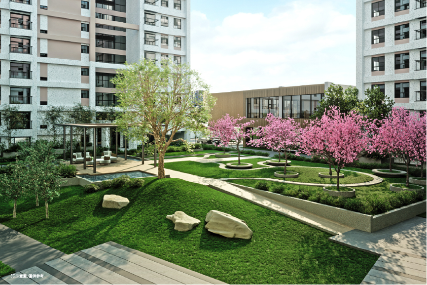 「遠傳丰景」內含一個景觀中庭花園,給一樓住戶瘋狂的花季盛宴,享受豐富的四季植栽計畫與逸趣水景,相當療癒的「視野」,以2月白色流蘇展開春天、3月櫻花霏霏、4-10月梔子香氣、6-10月繽紛紫葳、10-12月賞楓第一排,不同季節不同感受,住一樓花園房,天天生態、氣候、花季,「健康」又美麗。
