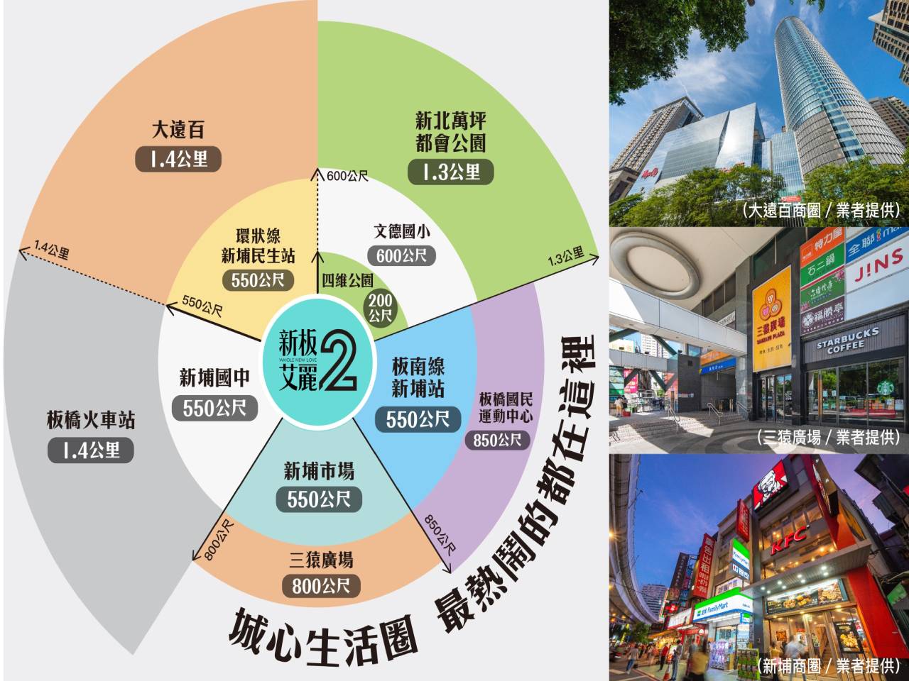 【新板艾麗2】有新埔市場滿足日常採買也有頂級百貨公司購物血拼;家中寶貝教育則有文德國小、新埔國中9年教育散步即可接送,板橋國民運動中心約850公尺,陪孩子跑跳放鬆享受幸福親子時光。