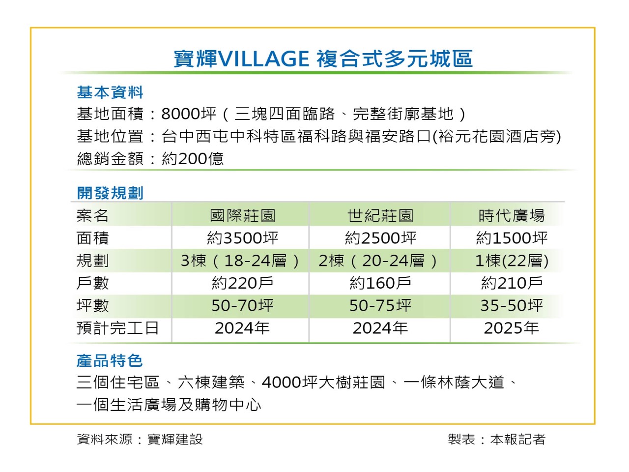 寶輝VILLAGE擁有近四個足球場大的遼闊腹地,由三個住宅區分別為「國際莊園」、「世紀莊園」、「時代廣場」、六棟建築、一個生活廣場、一個購物中心、一條林蔭大道及4000坪大樹莊園所圍塑而成,結合了居住空間、庭園綠地、健康休閒、社交娛樂、時尚購物、文化藝術、商業機能等多元複合式區域化設計,並在綠色莊園與主題廣場中置入咖啡書香、個性品味商店等讓人感到身心舒放的精神場域。