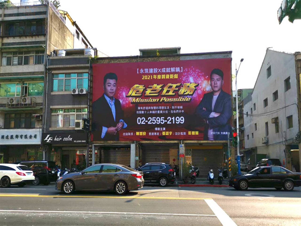 近日台北市民族西路上有一面猶如電影海報的大型戶外廣告,片名寫著「危老任務Mission Possible」、「2021不可錯過的年度賀歲鉅獻」、「永筑建設x成就解鎖」等敘述,令當地居民和過路民眾紛紛停下駐足,引發市場話題。
