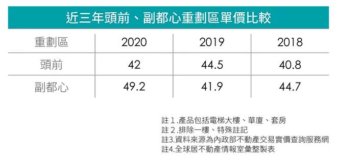 回顧近三年的兩重劃區房價變化,副都心在房地合一稅開始賣壓逐步走強,加上機場捷運線延宕,即便通車後也有效益不彰問題,又遇兩岸關係僵局,當地規劃的台商定居效益不振,都使其區域房價弱化,尤其因多為大坪數產品,過去還動輒五字頭的單價,都難讓後來的自住買盤接受,不時傳出賠售消息,在2019的交易量價同步下挫,平均單價41.9萬可說一步之遙跌破四字頭,相比產品更適合自住客的頭前重劃區,量價加溫,單價行情達44.5萬,自然在於當時副都心買氣冷清,低價、賠售才有交易機會,身價相較遜色。
