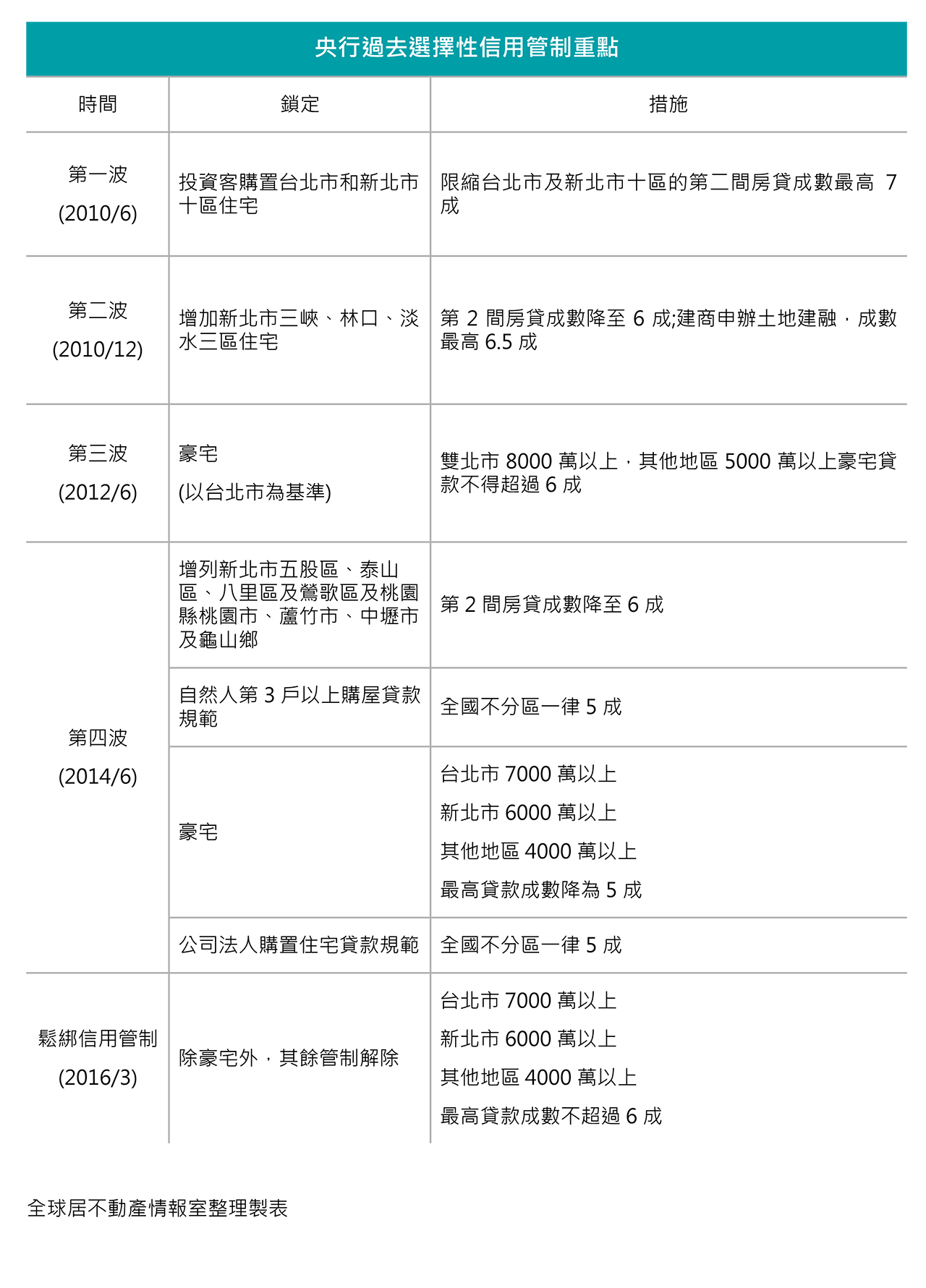 市場目前重提選擇性信用管制,2010年中央銀行推出第一波信用管制,一直到2016年初一共四波,不過這四波的房市信用管制在交易稅率計算基準過低下,影響效果有限,房市價量在2010到2014都一致走升,且特別是信用管制直指的豪宅與北北桃區域房市都相當火熱,不過當時的全球經濟投資風過熱,演變成之後金融風暴與歐、美債務問題,台灣小島難敵這股經濟起伏,或許信用管制起碼沒有讓台灣房市走向泡沫,仍有微幅抑制的功能。