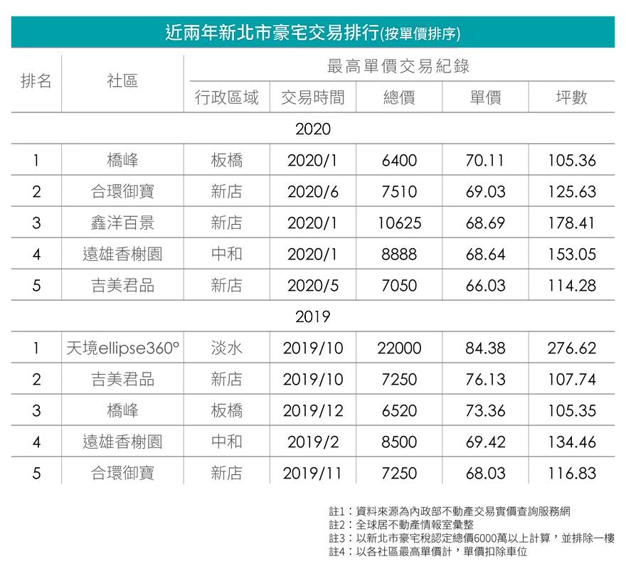 新北市豪宅近年僅2017年曾出現「巴黎16區」以90萬成交二樓戶,整體多以七字頭就算高價,能有80萬以上已是數一數二的冠、亞軍。觀察近兩年新北市超過6000萬豪宅稅門檻的買賣狀況,去年還有榜首淡水小坪頂豪宅「天境ellipse360°」,以單價84.4萬的八字頭水準撐住場面,交易兩戶高樓層毛胚屋,總價均為2.2億,第二與第三名也有七字頭,差強人意。然而今年迄今只有老字號新板特區「橋峰」見七字頭,為排行首位,單價是70.11萬,總價6400萬也壓在豪宅總價標準底線,其餘四豪宅單價都為六字頭,相比去年僅能排在第五名之後,同為新北市高價區塊的永和區,近兩年更是一間都沒有入榜,市況都不算太好。