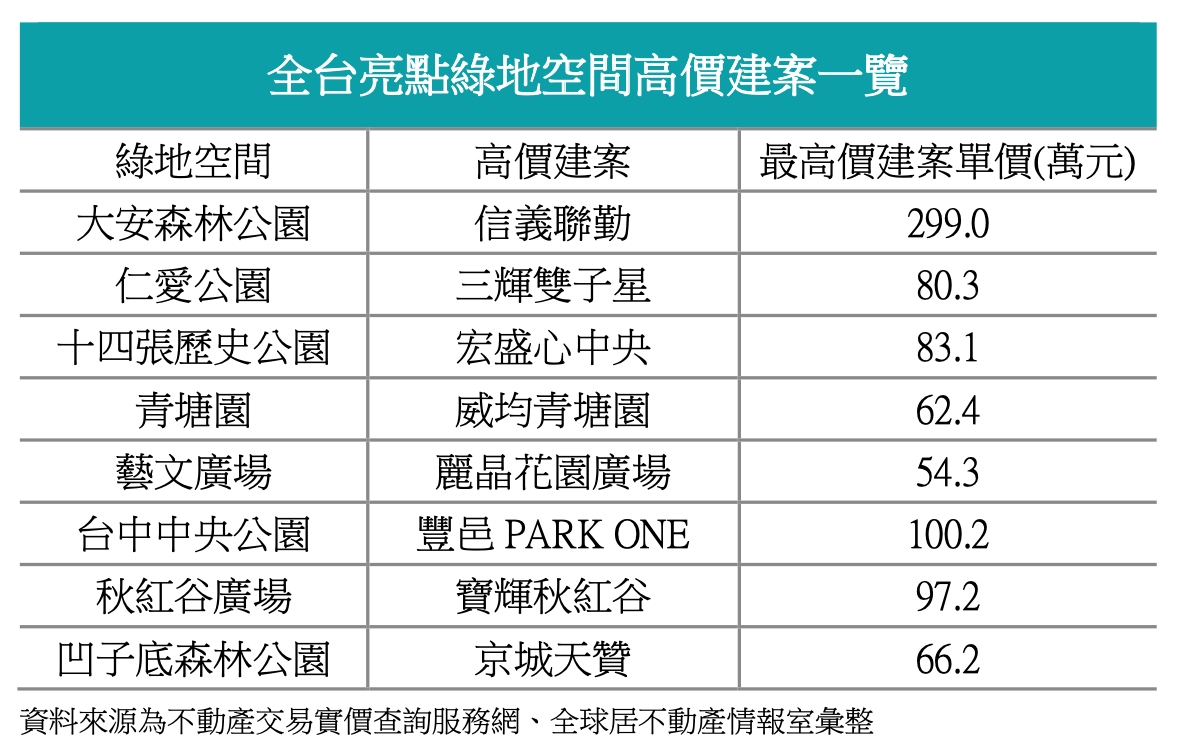 說起全台公園宅高價地段,北中南最值得一提的莫過於台北市大安區的大安森林公園、台中市七期的秋紅谷廣場,以及高雄市鼓山區的凹子底森林公園,都是金字招牌歷久彌新的豪宅聚落,分別有「信義聯勤」、「寶輝秋紅谷」,以及「京城天贊」作為指標,高標水位各自可達單坪200萬元,與9字頭、6字頭,雖另有社區規劃、名氣、投資價值、蛋黃地塊,以及購置者身份等多重價高因素,但共通特點的綠地公園概念,更彰顯在水泥叢林中,可與自然連結的珍貴性,不論是視野所及大片綠意,或是步行可達與綠為鄰,無疑深受資產階層青睞。