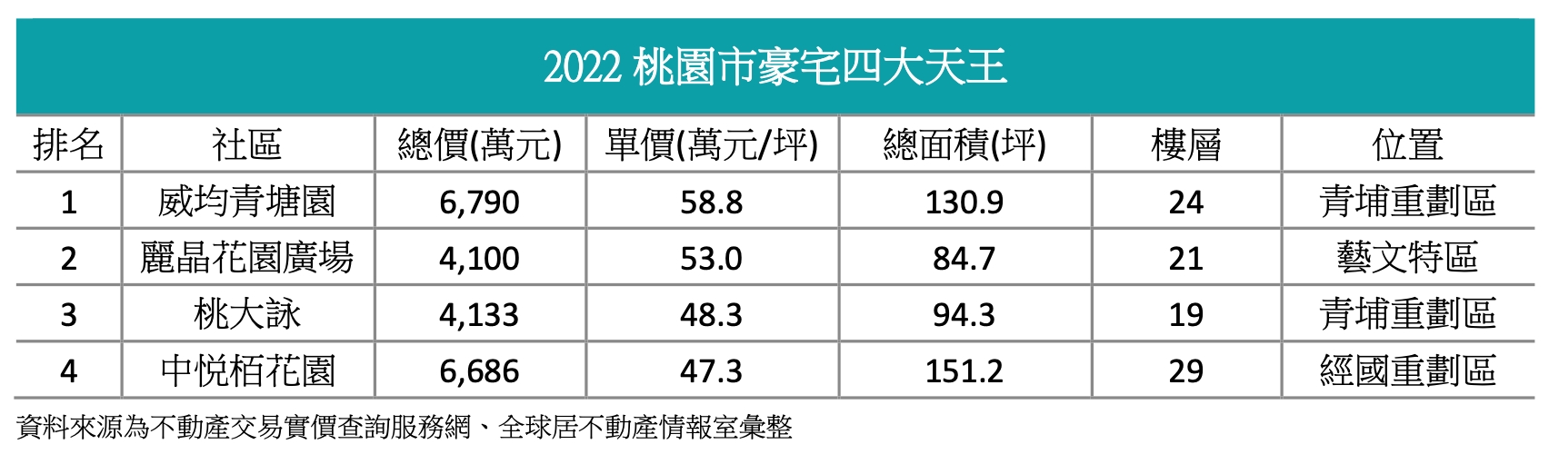 今年桃園市突破4000萬元豪宅稅門檻社區,單價排行前四名的四大天王分別為「威均青塘園」、「麗晶花園廣場」、「桃大詠」,以及「中悦栢花園」,單價在47.3-58.8萬元,其中「威均青塘園」與「桃大詠」為坐落在青埔重劃區的預售案,地緣因素下高價交易並不意外,同為預售交易的「中悦栢花園」位經國重劃區,南崁溪水岸景觀受高價買盤青睞,至於「麗晶花園廣場」則是藝文特區的2年屋齡新成屋,53萬元也創桃園區豪宅單價新高。