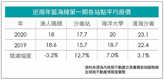 回顧過往捷運機能概念房市多在開通前發酵,觀察年底將通車的藍海線三站點,以及與綠山線交會的濱海沙崙站,以濱海沙崙站的周邊平均房價最高,今年已來到每坪23.1萬,漲幅上則以沙崙站周邊為多,幅度有12.7%,至於漁人碼頭站則是四站中唯一走跌站點,小跌3.2%,但實際均價也維持在18萬。