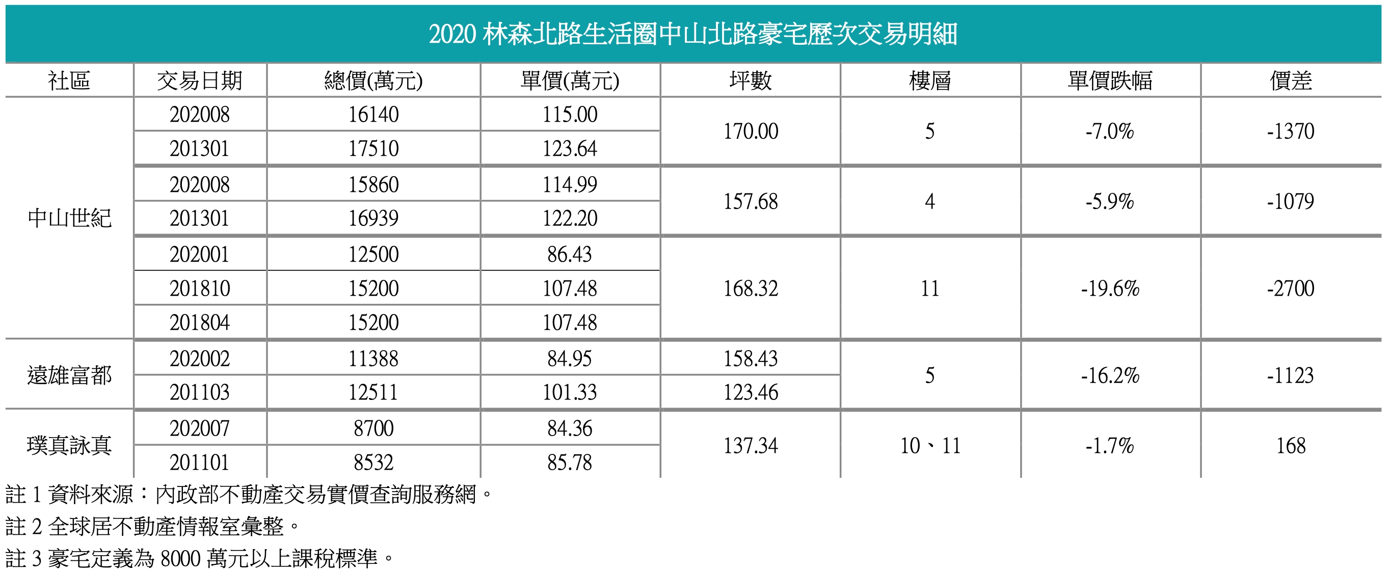 值得注意的是,屬於林森北路生活圈範圍的中山北路二段豪宅,除了近年屢傳賠售的「中山世紀」,今年持續出現慘賠實錄,像是11樓賠了2700萬元,單總價都創下新低,4樓與5樓也都賠了逾千萬元。另外如「遠雄富都」也在去年傳出8樓戶賠售3655>萬元後,今年5樓戶也出現加買車位,成交價格還更低的賠售1123萬元窘況,加上過去如「中山富御」、「玉山石」等都曾傳交易走弱,與前述老屋小宅產品多有獲利儼然呈現兩樣情。