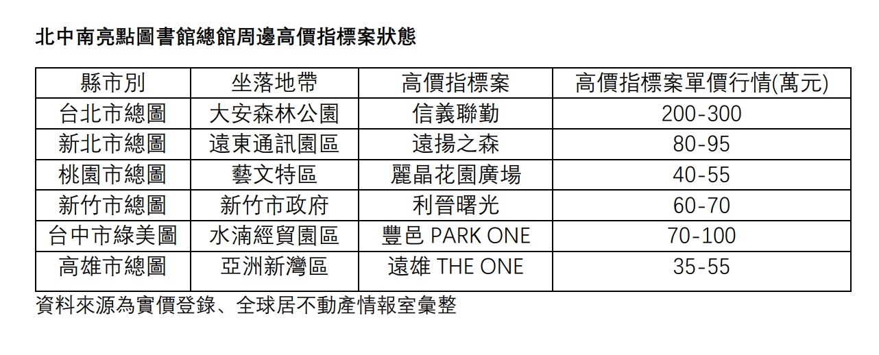 另外,像是新北市總圖在板橋區的遠東通訊園區;台中市興建中圖書館與美術館結合的綠美圖,進駐水湳經貿園區地帶;而完工僅10年,植栽綠樹於館內的高雄市總圖則在亞洲新灣區,分別有單價攀上9字頭的「遠揚之森」,和頂樓戶來到台中市住宅產品首見單坪百萬元的「豐邑PARK ONE」,以及在高雄市可與鼓山區媲美之亞灣區第一高價案「遠雄THE ONE」,至高單價近55萬元,讓圖書館所在巧妙連結起房市發展,雖不脫為地利之便,亦使圖書館成為另一重點居住機能。